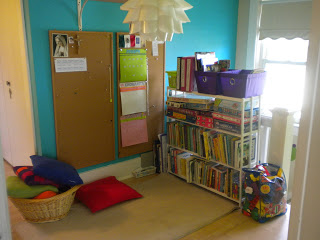 Este es un rincón que tenemos para leer, ya sea juntos o en forma individual. Las fotos son de diferentes ángulos. Este es uno de mis lugares favoritos para sentarnos en círculo, por eso tenemos los cojines en la canasta: