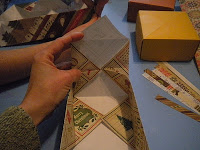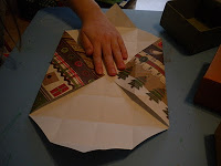 – Abre el último doblez que hiciste (esto forma una de las paredes laterales de la caja) y toma el extremo que queda en forma de triángulo para formar las paredes opuestas. Esta es la única parte que puede ser difícil la primera vez, porque no sé si se alcance a apreciar en la foto cómo se dobla la segunda pared. Básicamente, se meten los triángulos que se forman al tratar de doblar la hoja. En la primera foto se ve cómo queda después de doblar los triángulos. En la segunda foto ya está ese lado terminado. No necesitas pegamento, los mismos dobleces son suficientes para que la caja no se desarme.