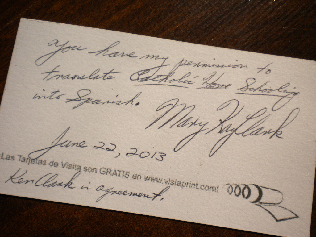 Este es el primer libro sobre homeschooling católico que leí y que me sirvió muchísimo cuando empecé, por eso me animé a contactar a la Dra. Clark para pedirle permiso de traducirlo. Tuve la fortuna de conocerla en persona el pasado junio en la Conferencia Nacional de Homeschooling en Virginia. Para entonces, ya había hablado con ella por teléfono y ya me había dicho que sí, pero ese día, le pedí que me diera su permiso por escrito.