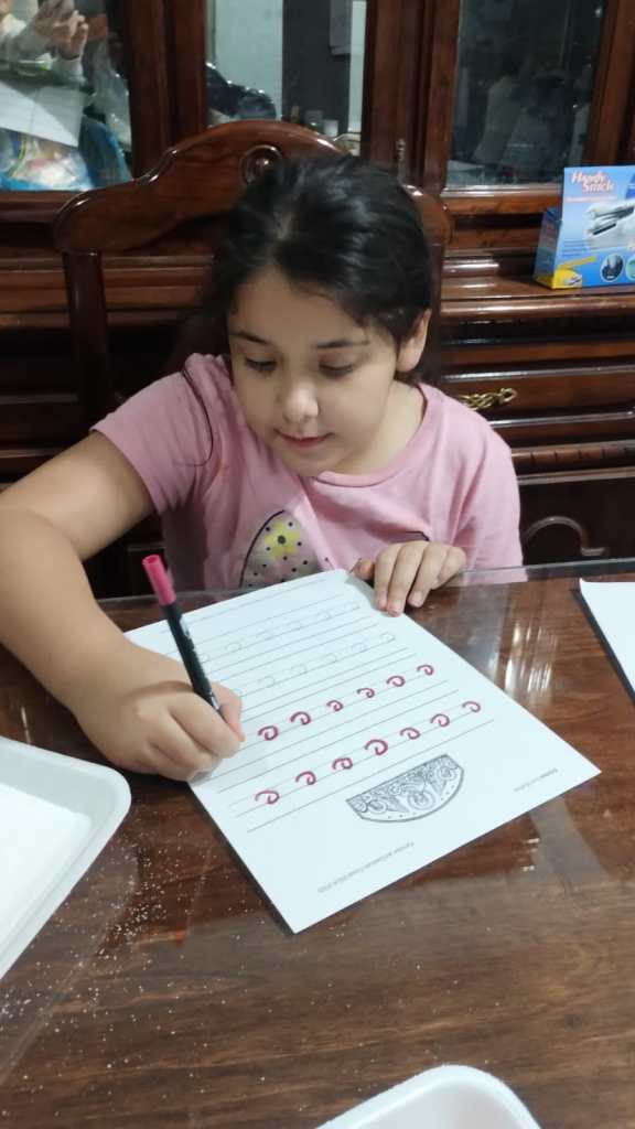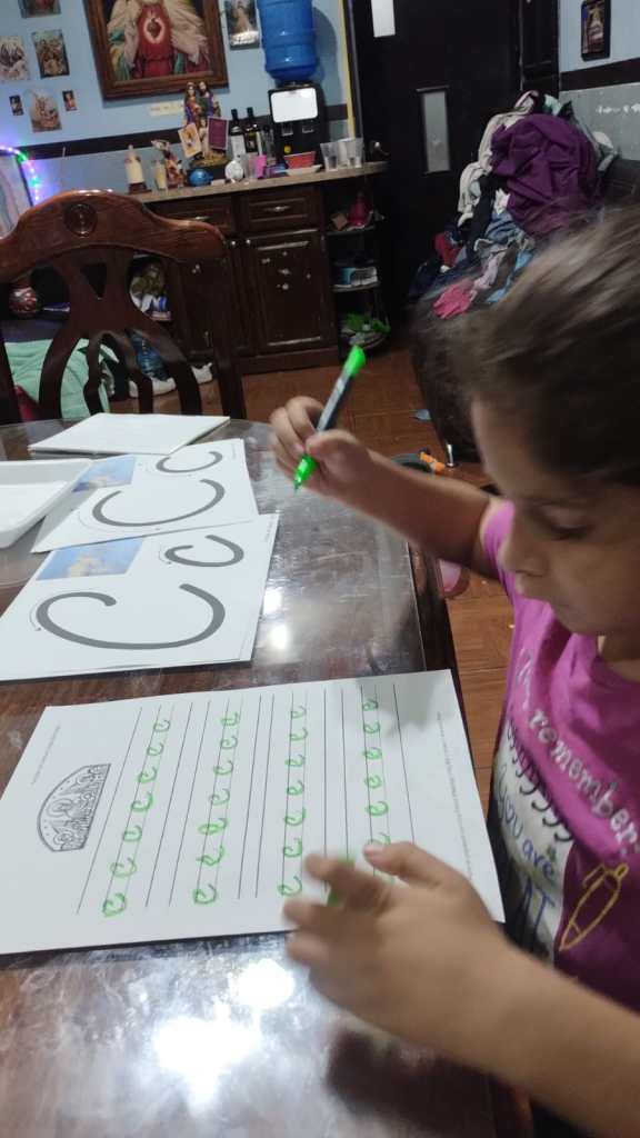 Transcribimos los trazos en cursiva de la letra /c / minúscula de las hojas de trabajo. Repasamos varias veces la letra /c / en un plato con sal. Transcribimos sobre las hojas de trabajo las letras en cursiva tanto minúsculas como mayúsculas.