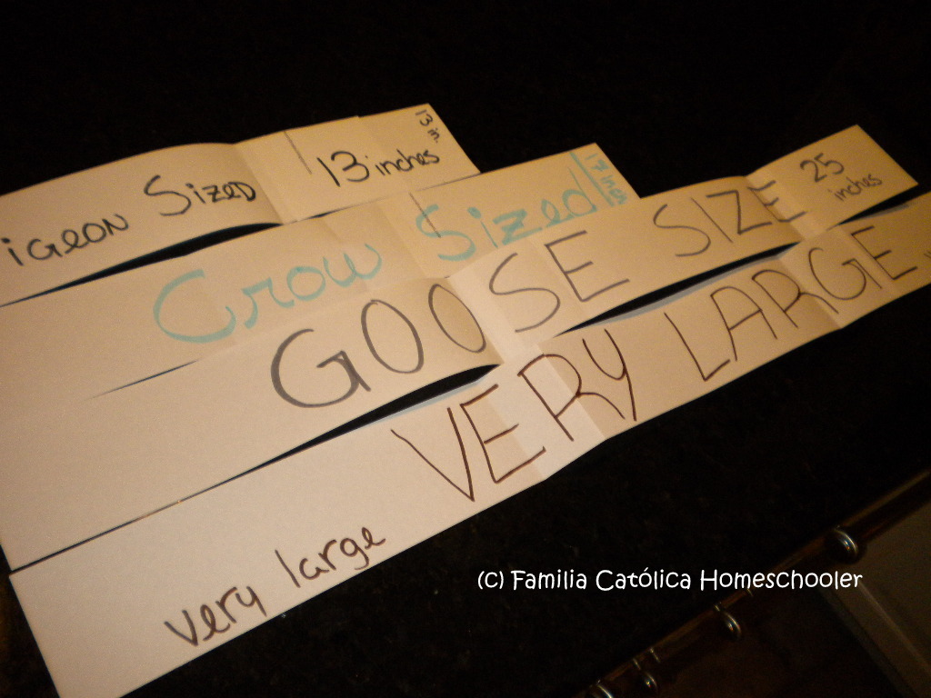 Una actividad sugerida (nosotros no siempre hacemos todo, esto ya es decisión de cada familia) fue hacer tiras de papel con las medidas de los tamaños de los pájaros. Esto me gustó porque les dió a los niños un apoyo visual para darse una idea de cada medida. Estas son algunas de las tiras que hicieron: