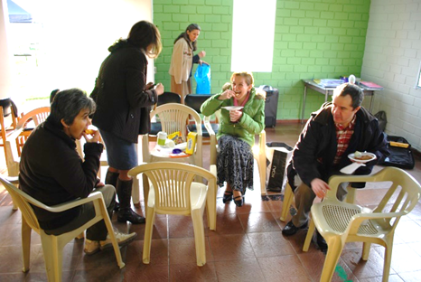 Llegamos muy tempranito (como a las 7:00 am) para tener tiempo de arreglar el lugar y también aprovechamos para desayunar. Por bondad de Ana Carolina (esposa de Alejandro), aquí estamos desayunando lo que nos llevó: